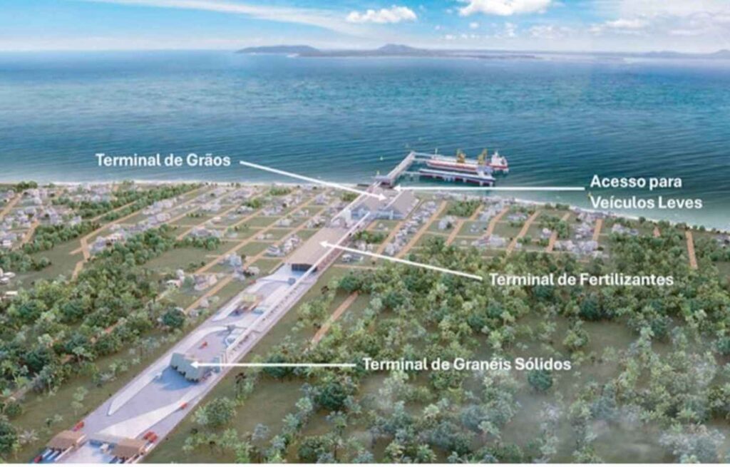 Embora o foco inicial seja o escoamento de grãos, como soja e farelo, o projeto já nasce com uma proposta mais ampla. A ideia é integrar diferentes operações dentro de um mesmo complexo portuário.